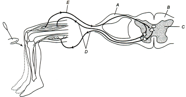 8.Identify the parts labelled as A and E and choose the correct option for the diagrammatic representation of reflex action showing knew-jerk reflex
