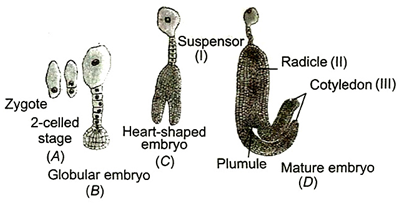 24.Identify the different stages in embryogenesis in the given diagram A,B,C and D