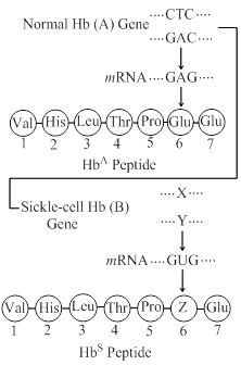 22.Sickle-cell anaemia is an autosomal linked recessive trait can be transmitted from parents to the offspring when both the partners are carrier for all the genes or heterozygous. The disease is controlled by a single pair of allele, $Hb^A$ and $Hb^S$. Identify X, Y and Z