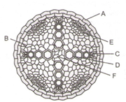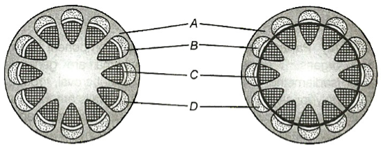 8.Given below the diagram of secondary growth in dicot stem (diagrammatic). Identify A to D