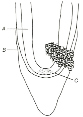 44.Identify A,B and C indicated in diagram of root apex given below