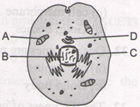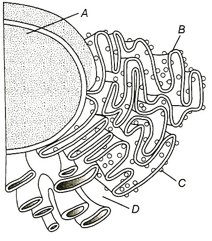 16.Identify the components labelled A,B,C,D and E in the diagram given below from the list I to VIII given along with it Components I. Cristae of mitochondria II. Inner membrane of mitochondria III. Cytoplasm IV. Smooth endoplasmic reticulum V. Rough endoplasmic reticulum VI. Mitochondrial matrix VII. Ribosome VIII. Nucleus The correct components are